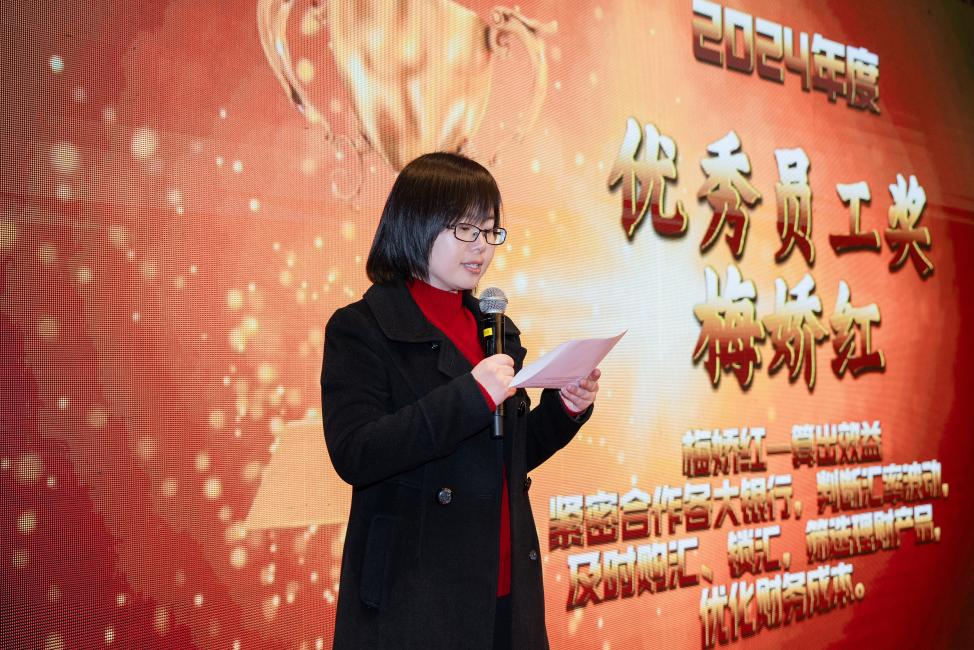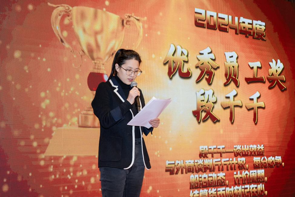 年會(huì)上,公司對(duì)2024年度表現(xiàn)突出的優(yōu)秀員工進(jìn)行了隆重表彰。段千千、梅嬌紅、劉力超榮獲”優(yōu)秀員工獎(jiǎng)”稱號(hào),[甲醇組]憑借卓越的工作表現(xiàn)和突出的貢獻(xiàn),榮獲“先進(jìn)集體獎(jiǎng)”稱號(hào)。董事長(zhǎng)親自為獲獎(jiǎng)員工及團(tuán)隊(duì)頒獎(jiǎng),并鼓勵(lì)全體員工以他們?yōu)榘駱?,在新的一年中再接再厲,?zhēng)創(chuàng)佳績(jī)。優(yōu)秀員工表彰環(huán)節(jié)不僅是對(duì)個(gè)人、團(tuán)隊(duì)努力的肯定,也激勵(lì)了全體員工在新的一年中奮勇向前。
